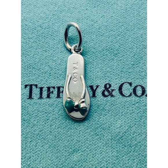 | Product Features | Tiffany & Co. Flip Flop Blue Enamel Pendant Charm Sandal Sterling Silver With PouchMissing some of the enamel from the right side, still looks good Has been cleaned and polishedmeasures 28mm including bailcomes with Tiffany box, pouch, shopping bag and ribbon | ||