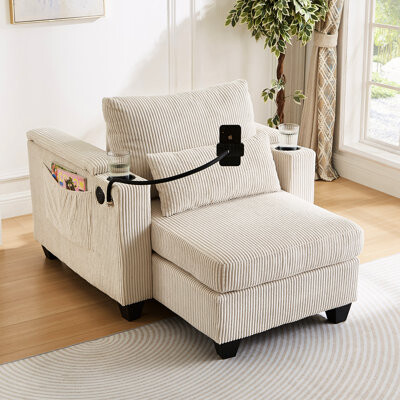 | Product Features | Details:when it comes to furnishing a living space, especially in small apartments or multifunctional rooms, finding a piece of furniture that combines comfort, functionality, and style is crucial. this convertible chaise lounge chair is a perfect solution. with its dual - mode convertible design, it can effortlessly transform from a spacious chaise lounge to a functional chair. just push backward, and seat area extends, providing you with a comfortable lounging space. this space - saving design is a game - changer for those who want flexibility without sacrificing comfort. multi - functional of this are a great addition. both left and right have hidden storage compartments. you can store remote controls, chargers, reading glasses, or even snacks in these compartments. integrated cup holders on keep your beverages secure and within easy reach. whether it's a movie night or just a casual lounging time, having your drinks close by is so convenient.for tech - savvy users, charging ports and flexible phone holder are a dream come true. dual charging ports are built directly into armrest, allowing you to charge your phones, tablets, or e - readers without having to get up from your seat. flexible phone holder enables hands - viewing for streaming, video calls, or browsing. you can stay connected and entertained while relaxing on this . is upholstered in high - quality corduroy fabric. soft corduroy fabric has a texture with a distinct ribbed pattern. it not only gives a stylish, retro - inspired charm but also provides a cozy and warm feel. fabric is , ensuring that will last for a long time.a supportive lumbar pillow is included with . this pillow offers excellent lower back support, which is essential during long periods of sitting or reclining. it enhances ergonomic support and overall lounging comfort. side storage pockets on both sides of are very practical. you can keep reading materials, tablets, tv remotes, or small accessories in these pockets. they help to keep living space clutter - and make it easy to access your essentials.this is easy to assemble. it comes with all necessary accessories and detailed instructions. overall dimension of is 37.4"w*53.9"d*31.5"h, and it has a weight capacity of 250 lbs per seat. seat height from floor is 16.9 | ||